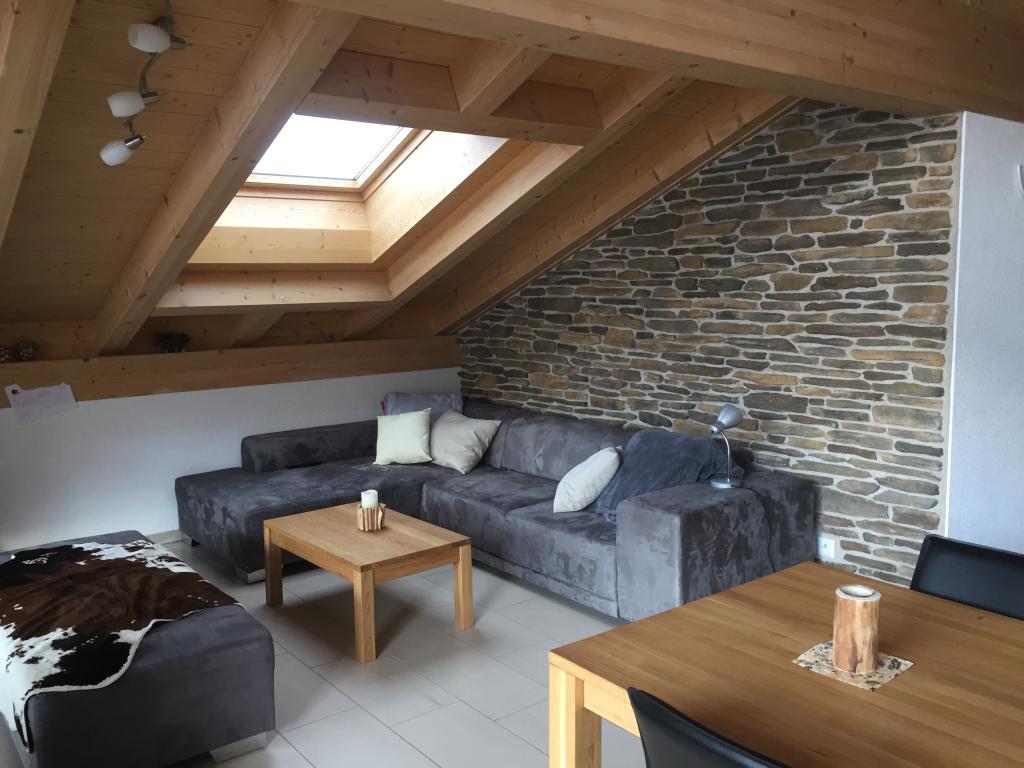 Dachwohnung im Haus Arena II A; Wohn-Esszimmer mit Esstisch aus rustikalem Eichenholz und Lederstühlen. Satelliten-TV mit integrierten Radiosendern. Küche komplett eingerichtet mit Nespresso-Kaffeemaschine, Glaskeramik und Kombi-Backofen (Mikrowelle/Steamer). Fondue-Set und Racletteofen. Küche komplett eingerichtet für max. 5-6 Personen.