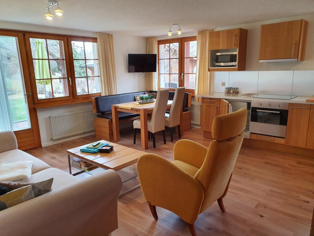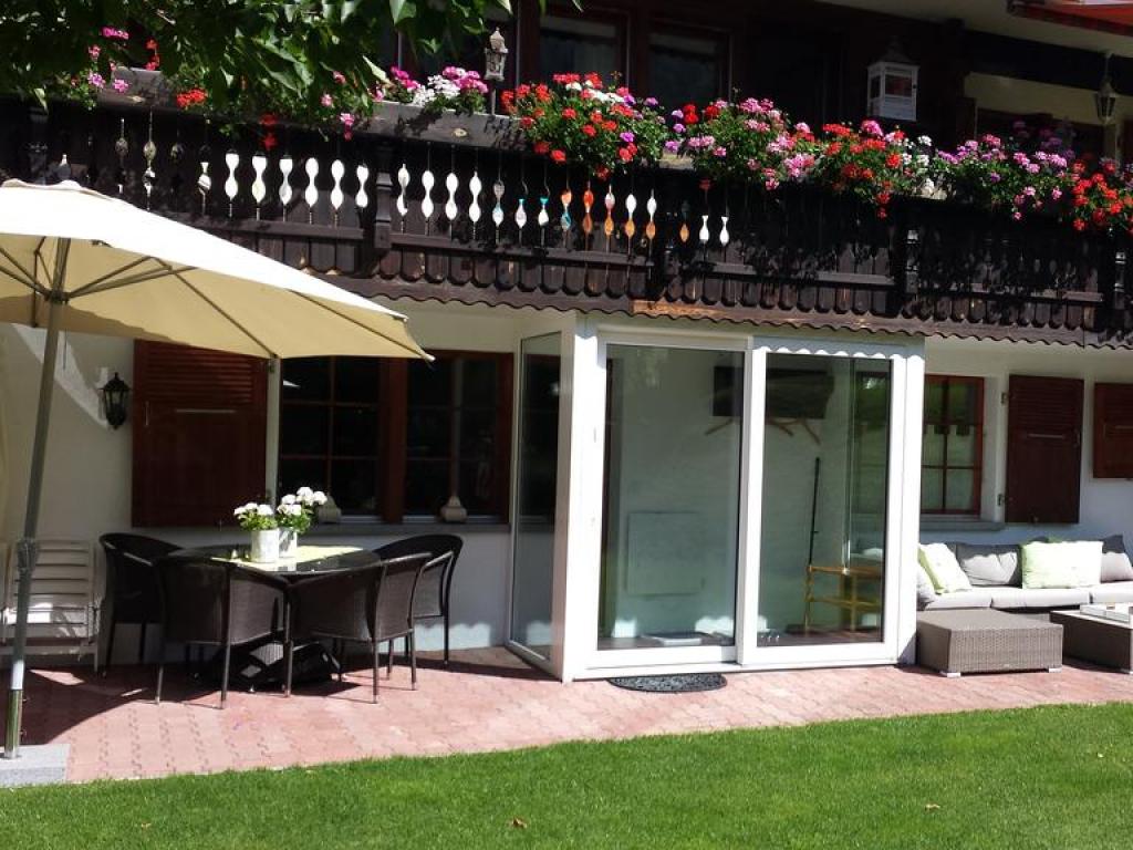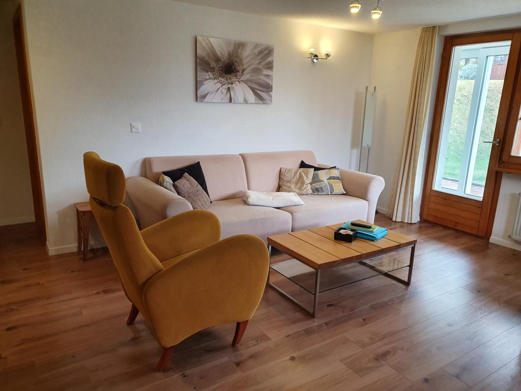 Ruhig gelegene 3 -Zimmerparterre-Wohnung für 4 Personen, möbiliert und bestehend aus: 2 Doppelzimmer, Bad/WC,Wohnzimmer mit SAT TV, Radio/CD, sehr gut eingerichtete Küche mit Geschirrspüler, Mikrowelle, Backofen, Wasserkocher, Kaffeemaschine (Filterkaffee) und Tassimo-maschine. Grosser Rasenvorplatz, bestuhlte Terrasse auf der Südseite mit Blick auf Brunegg- und Weisshorn. Das Chalet ist mit dem Auto zu erreichen und der Parkplatz ist inklusive. Kindern steht auf dem Rasen eine Spielecke zur Verfügung und im Winter dürfen Schlitten und Bob benützt werden.Internet gratis.