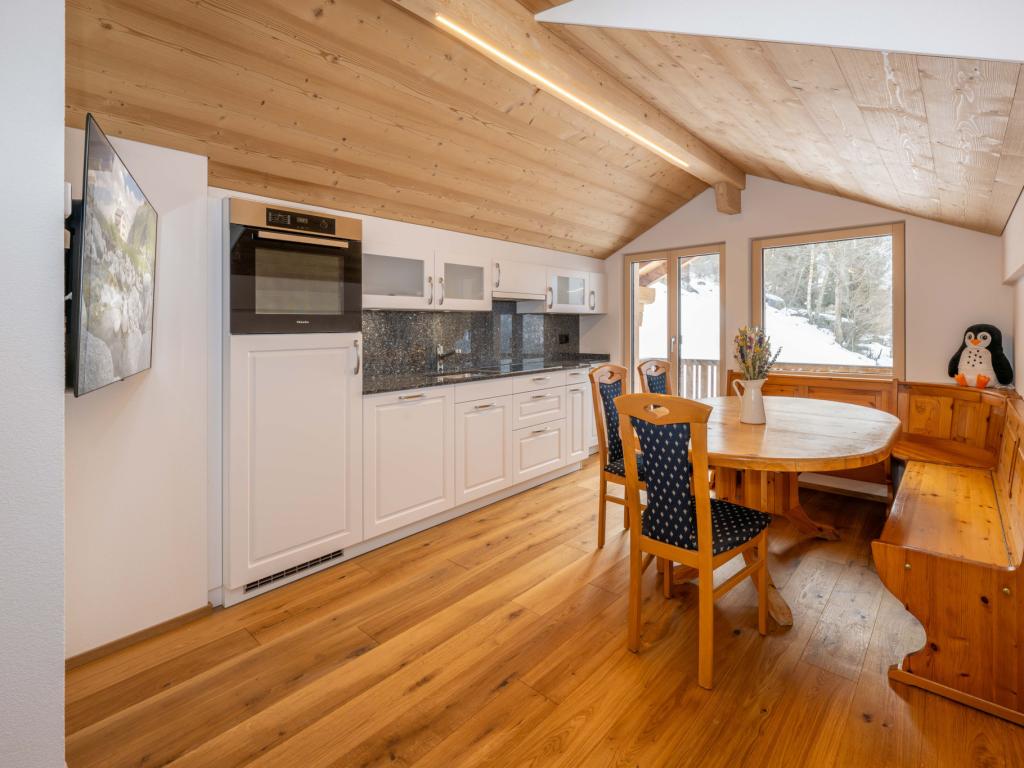 Die Wohnung verfügt über ein Schlafzimmer mit Doppelbett (180x200cm). Die Wohn- und Essküche kann mittels einer Schiebewand zu einem weiteren Schlafbereich mit konfortablem Bettsofa für 2 Personen abgetrennt werden (Masse Bettsofa: 160x200cm). Ein kleines Zimmer in der Dachschräge könnte von 2 Kindern genutzt werden. Der höchste Punkt in diesem Zimmer beträgt etwa 1,64m; der Türdurchgang ist ca. 1,40m hoch. Im Zimmer gibt es zwei Betten von je 90x200cm. Auf Wunsch stellen wir Ihnen ein Kinderbettchen und einen Kinderhochstuhl zur Verfügung. Eine kleine Kinderspielecke ist vorhanden. Die Küche im Landhausstil verfügt über eine moderne Ausstattung, inkl. Geschirrspüler, Induktionsherd, Nespressokaffeemaschine und Wasserkocher. Alle notwendigen Küchengeräte wie Racletteofen und Fonduset sind vorhanden. Das Badezimmer ist mit Duschkabine, WC und Lavabo ausgestattet. Die Temperatur der Bodenheizung können Sie über raumgetrennte Displays regulieren. Der Balkon befindet sich in Südlage und bietet Ihnen einen schönen Ausblick aufs Dorf und auf die Bergwelt. Im Treppenhaus finden Sie einen beheizten Skischuhraum. Den TV können Sie mit dem Schwenkarm drehen, sodass Sie sowohl vom Esstisch als auch vom Bettsofa aus fernsehen können. Netflix, Disney+ und Internet per Wi-Fi können Sie gratis nutzen. Für Ihr Auto steht eine Einzelgarage zur Verfügung. Von dort gelangen Sie über einen breiten Zugangsweg zum Chalet. Im Sommerhalbjahr steht ein überdachter Gartensitzplatz inkl. Grillgelegenheit (Gasgrill) zur Verfügung.